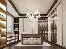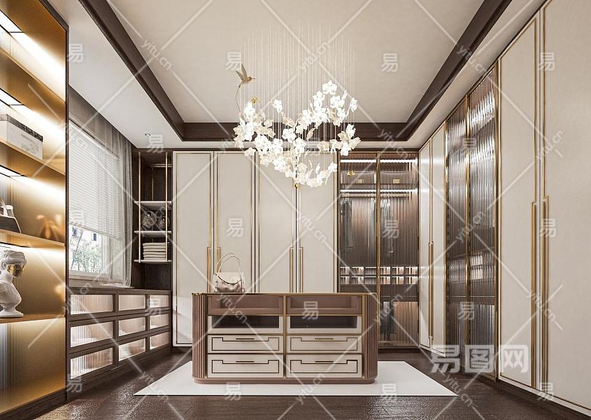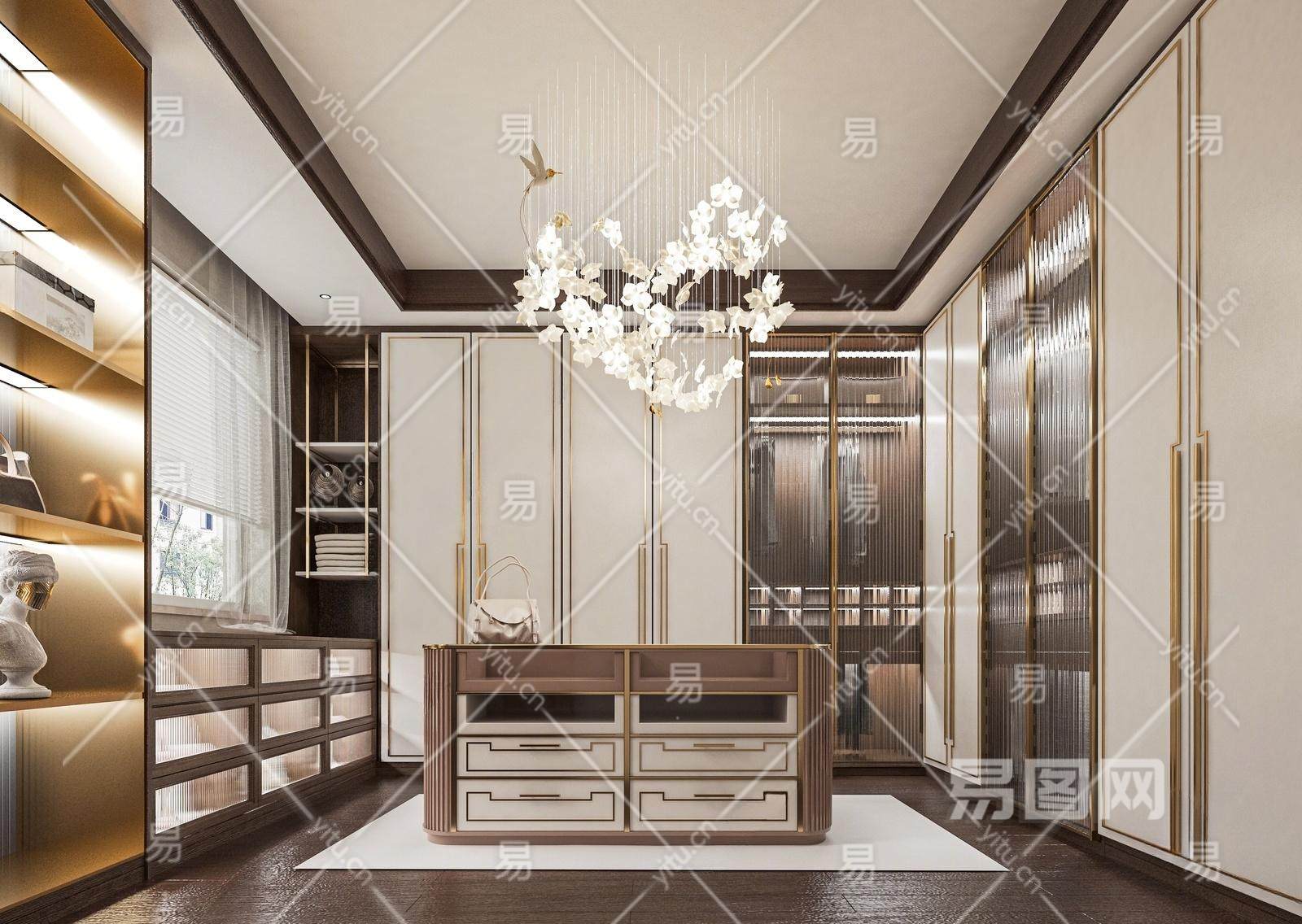 新中式衣帽间 衣柜 梳妆台 窗帘 装饰品 包包 化妆品 沙发凳 吊灯