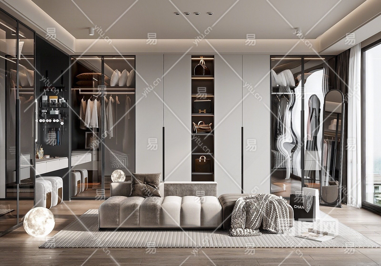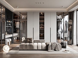 现代衣帽间 衣柜 衣服鞋帽 地毯 换鞋凳 沙发凳 月球灯