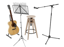 酒吧舞台设备,话筒音谱架,吉他乐器,吧凳su草图模型下载