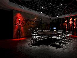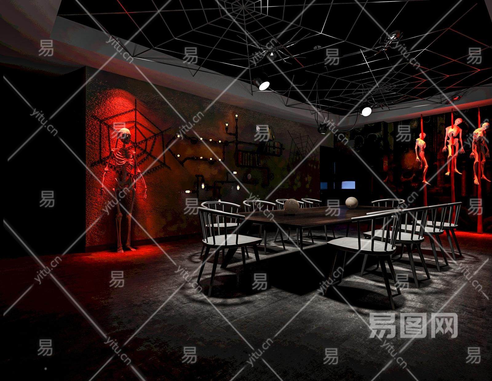 工业风剧本杀 鬼屋 骷 密室逃脱 狼人杀 骷髅 蜘蛛网 桌椅 恐怖密室