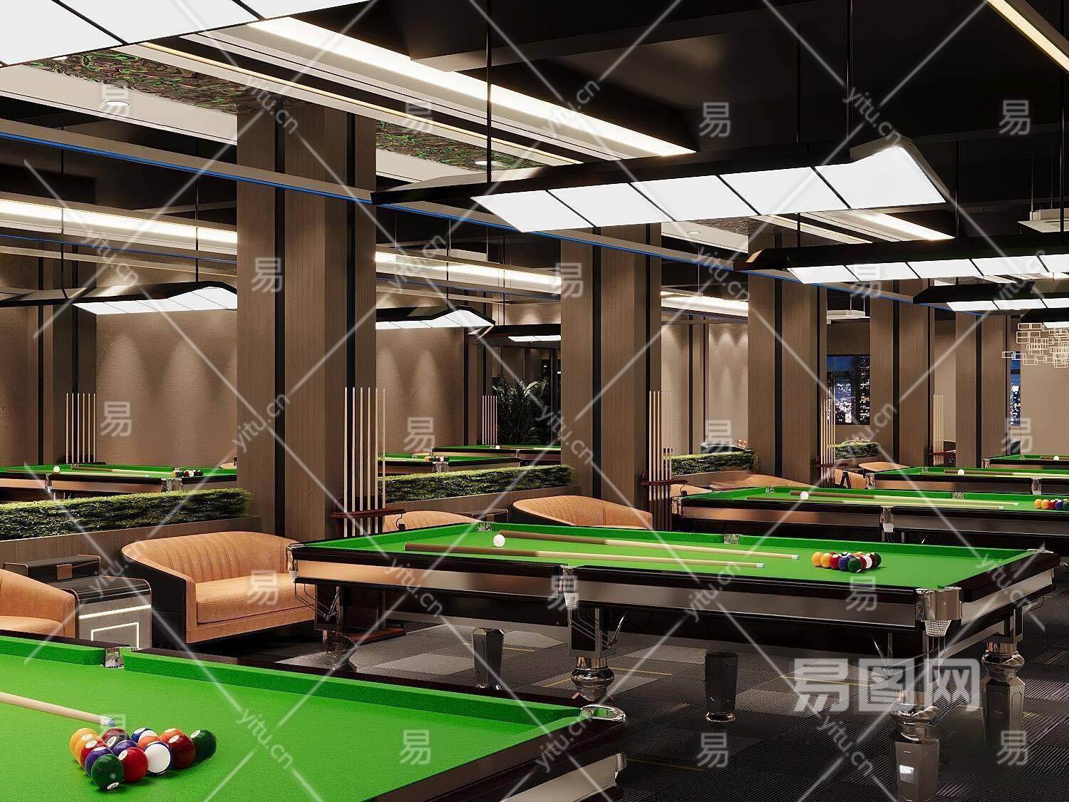 现代台球室台球厅 台球室 台球桌 台球杆 台球装饰品