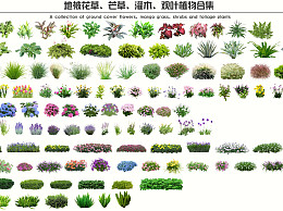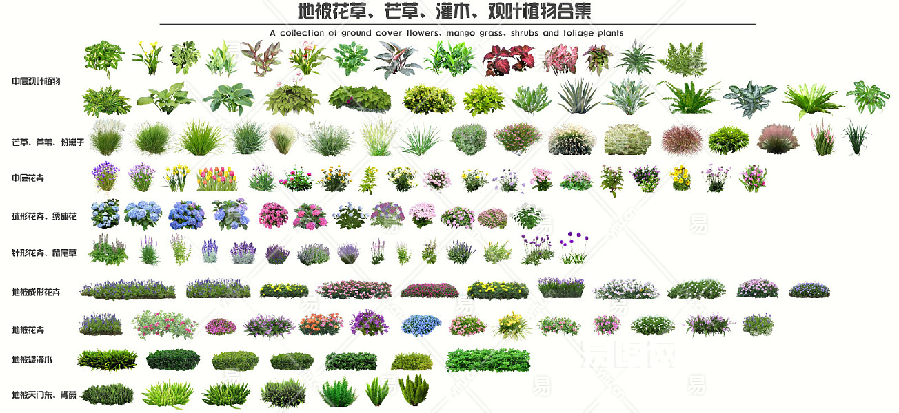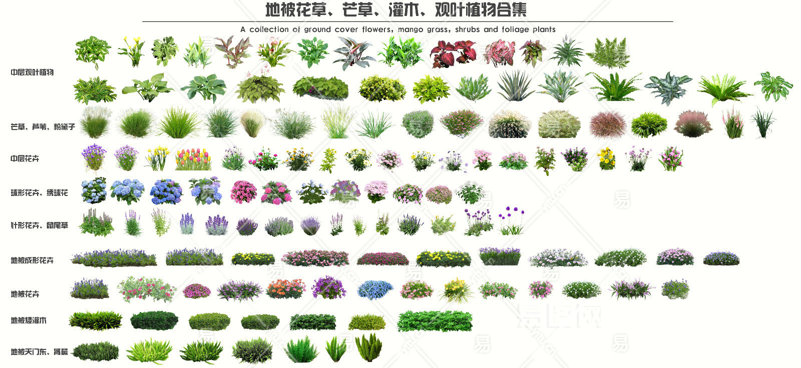 现代地被花草植物 灌木 球灌 观叶植物 花卉 花镜 绣球花 芒草茅草 水草