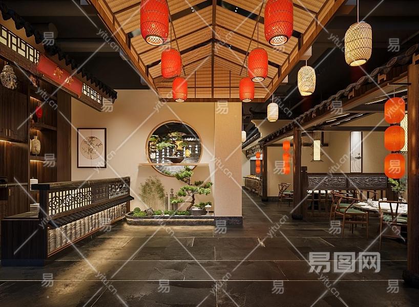 中式徽派餐饮店大厅 收银台 景观小品 灯笼 餐桌椅组合