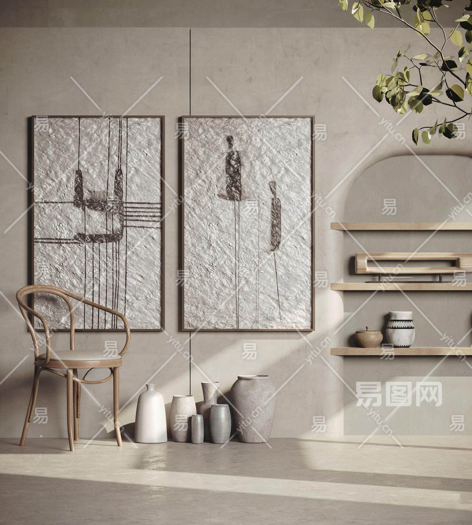 侘寂休闲椅 饰品摆件组合 装饰画 椅子 陶罐