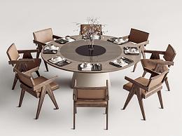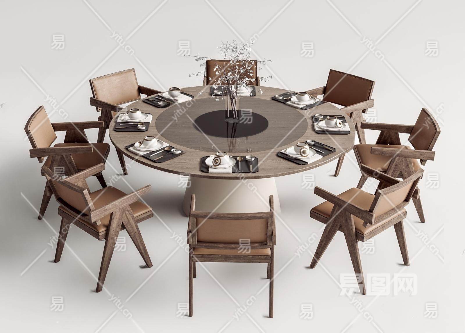 新中式餐桌椅组合 圆桌椅组合 餐具组合 花瓶花艺摆件