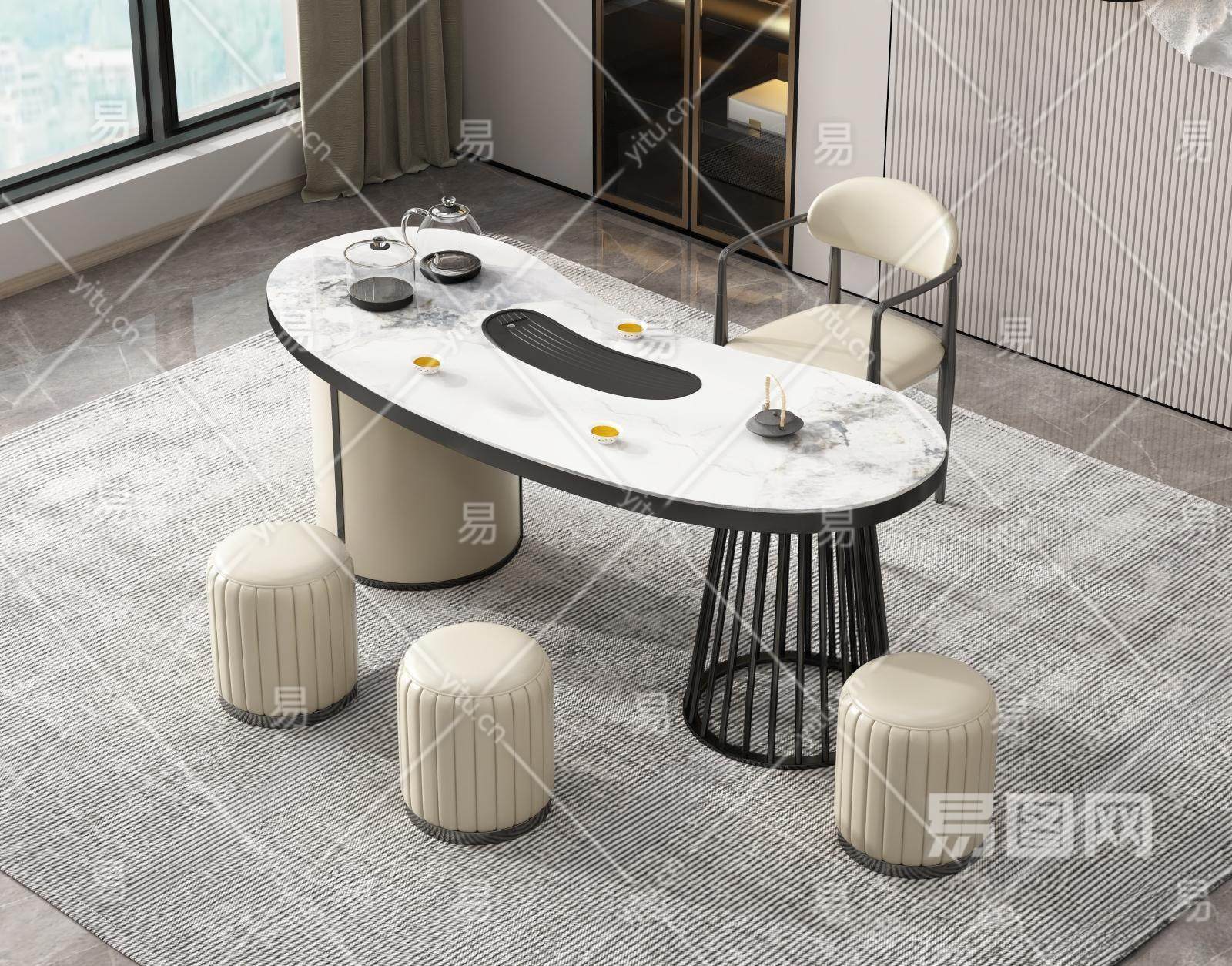 现代茶桌椅组合 大理石泡茶桌 岩板茶台 金属椅 沙发凳 茶具 书柜 水壶