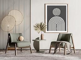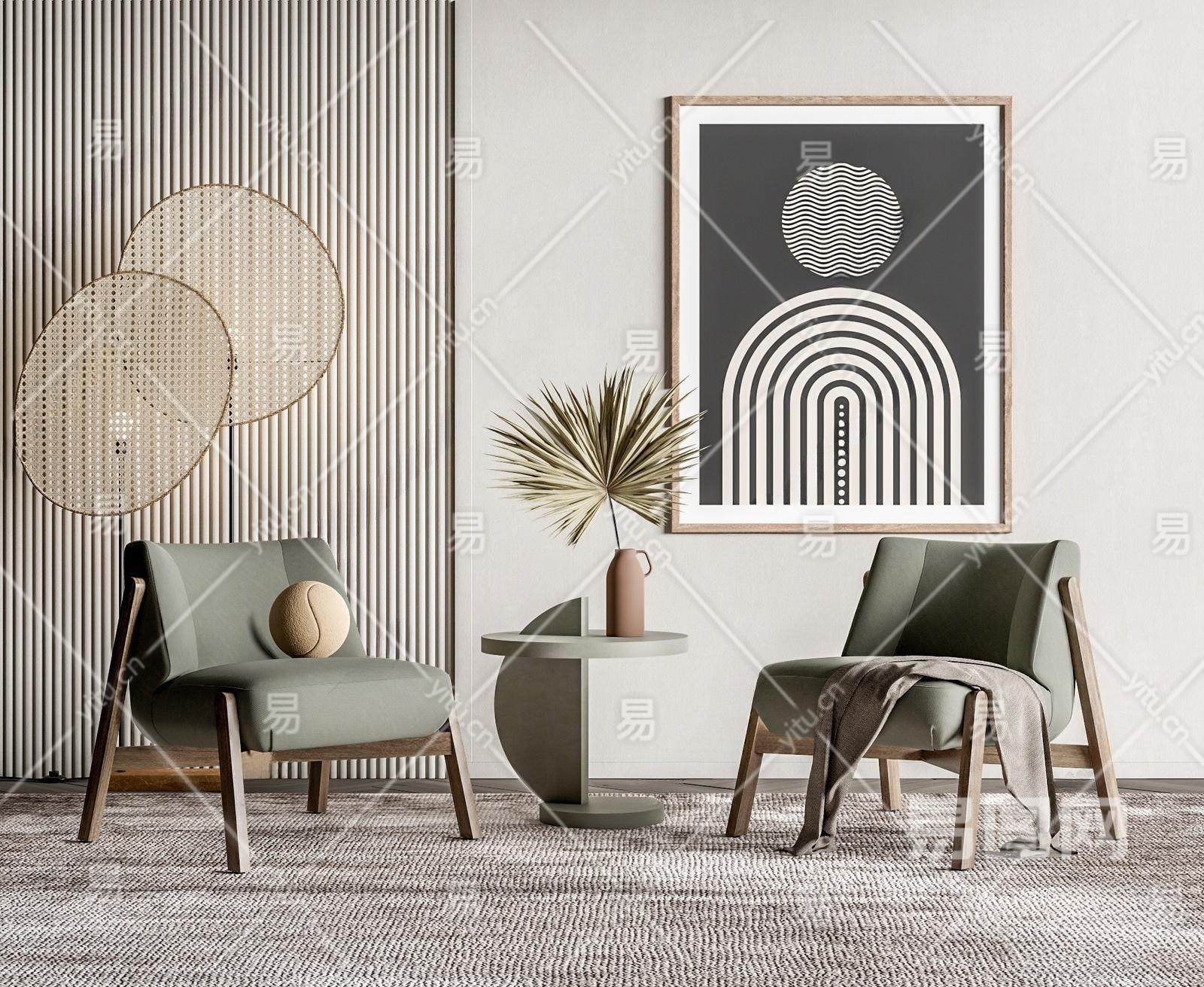 侘寂休闲椅角几组合 藤编落地灯 装饰画 花艺摆件