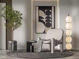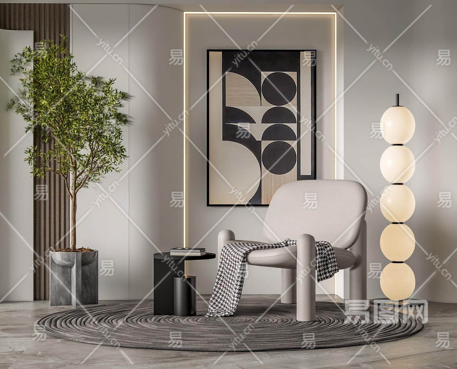 现代休闲椅角几组合 落地灯 盆栽 装饰画