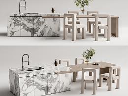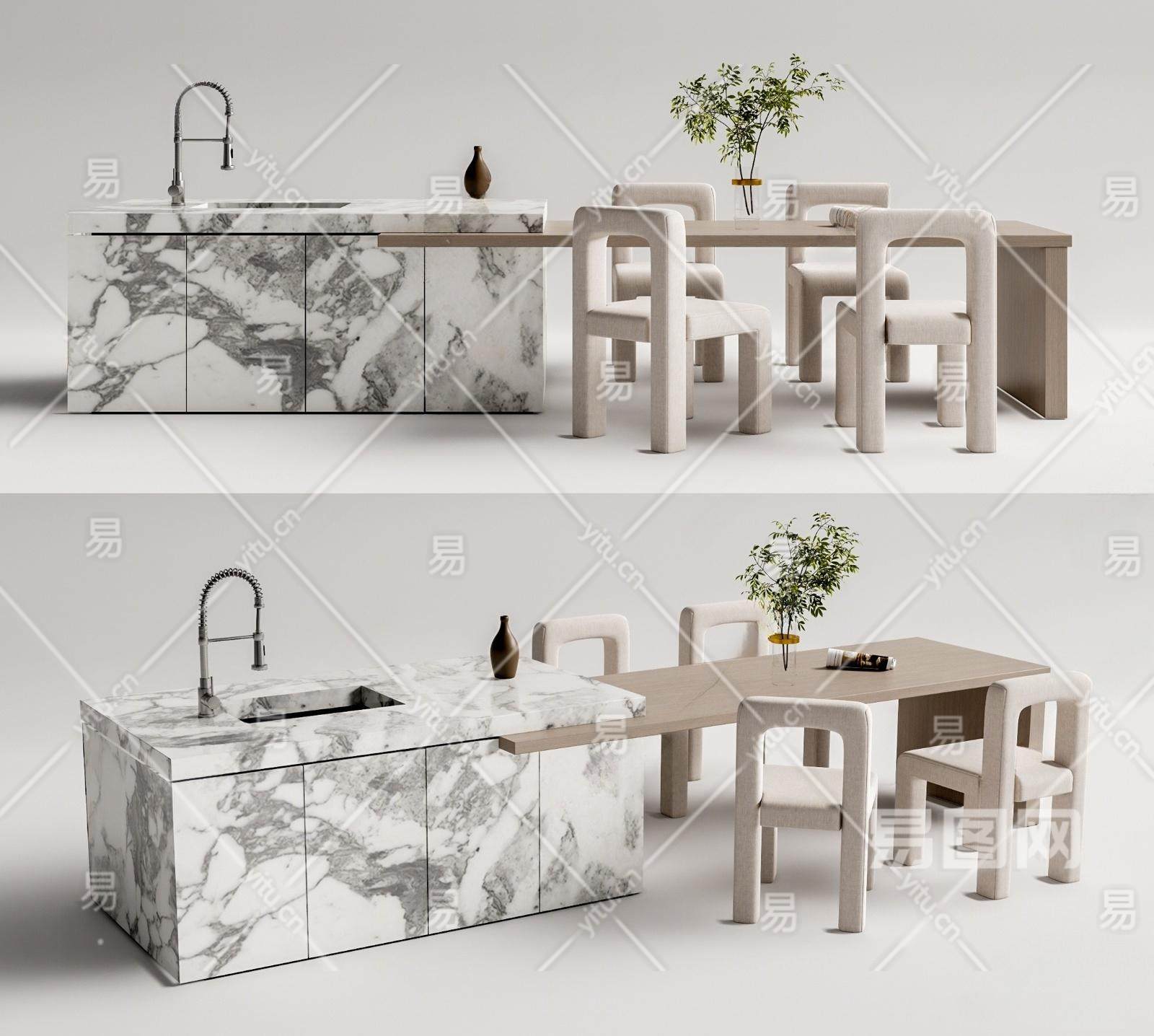 现代西厨早餐台 中岛吧台 餐桌椅组合 绿植花瓶 洗碗池 龙头