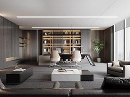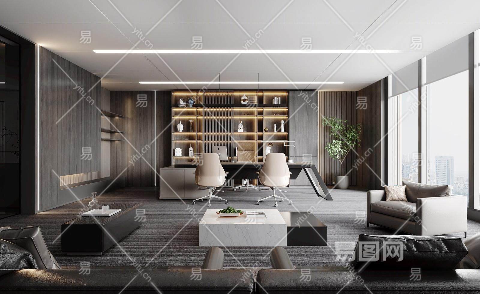 现代总经理办公室 办公桌椅 沙发茶几组合 书柜 雕塑摆件 休闲椅