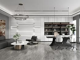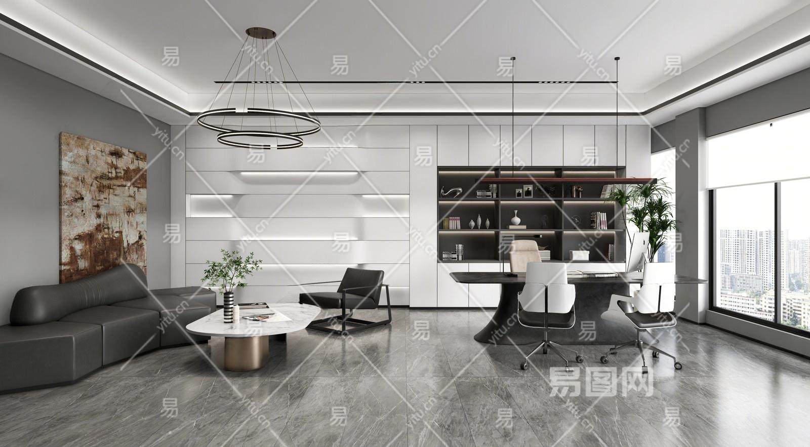 现代总经理办公室 办公桌椅 沙发茶几组合 吊灯 书柜 休闲椅