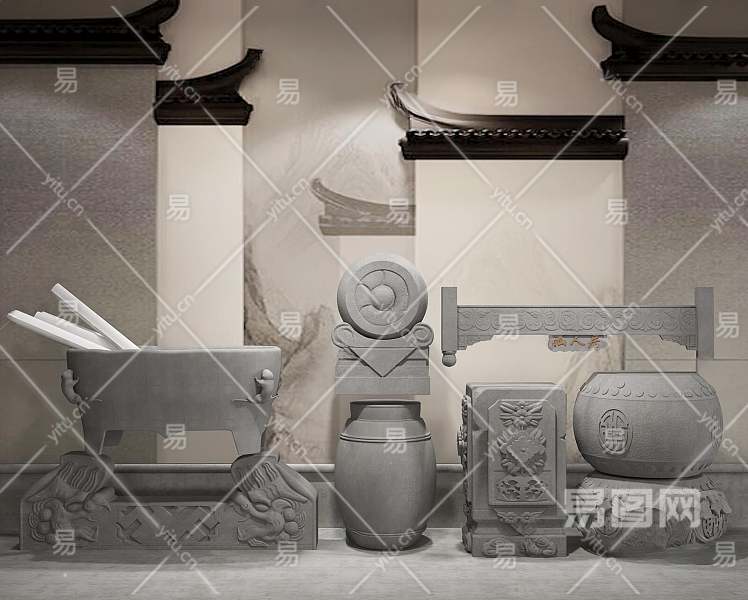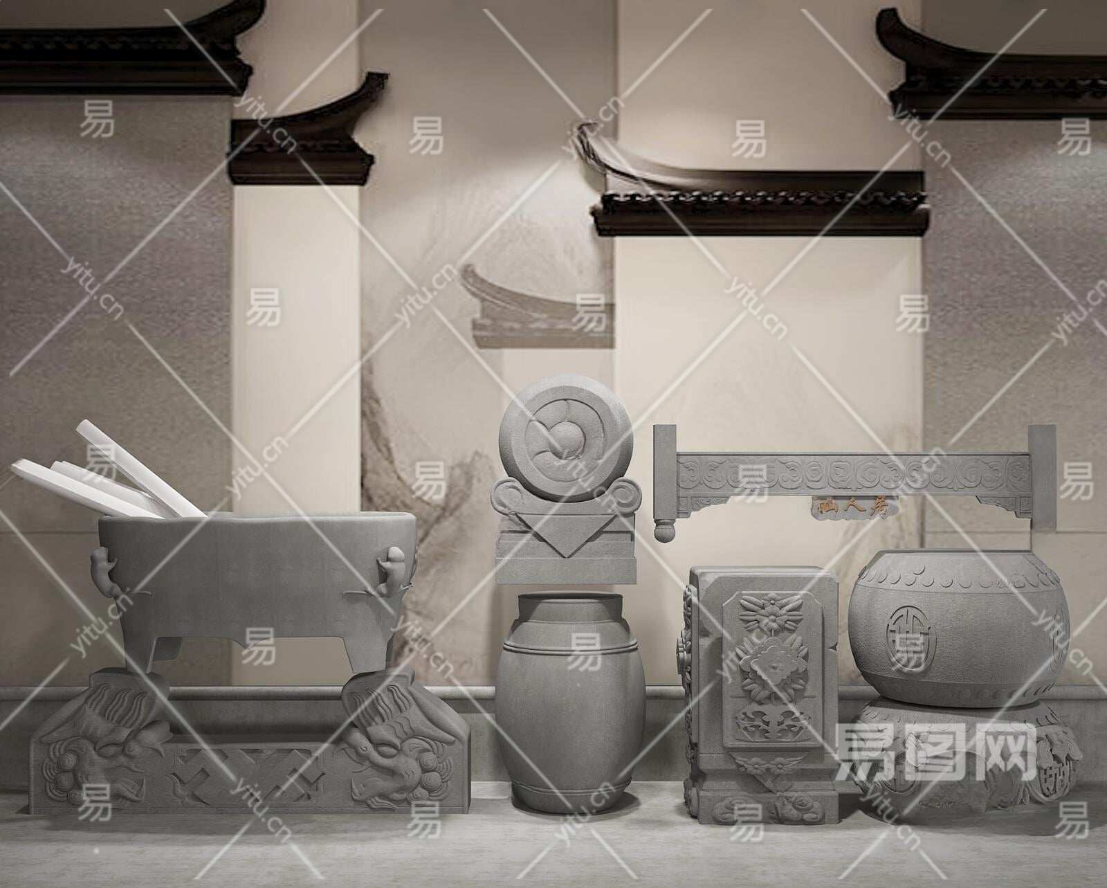 中式抱鼓石柱凳雕塑挂落3D模型下载