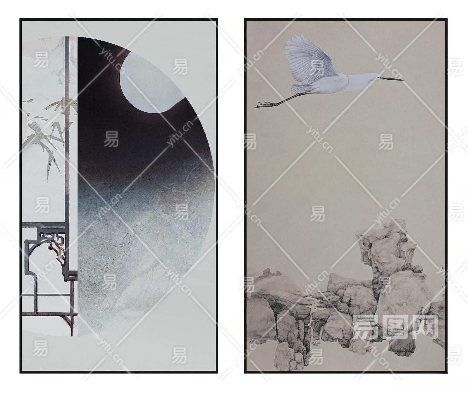新中式禅意意境飞鹤月亮挂画组合3D模型下载