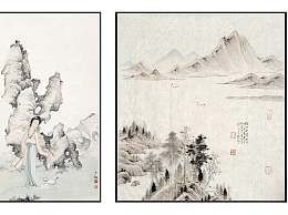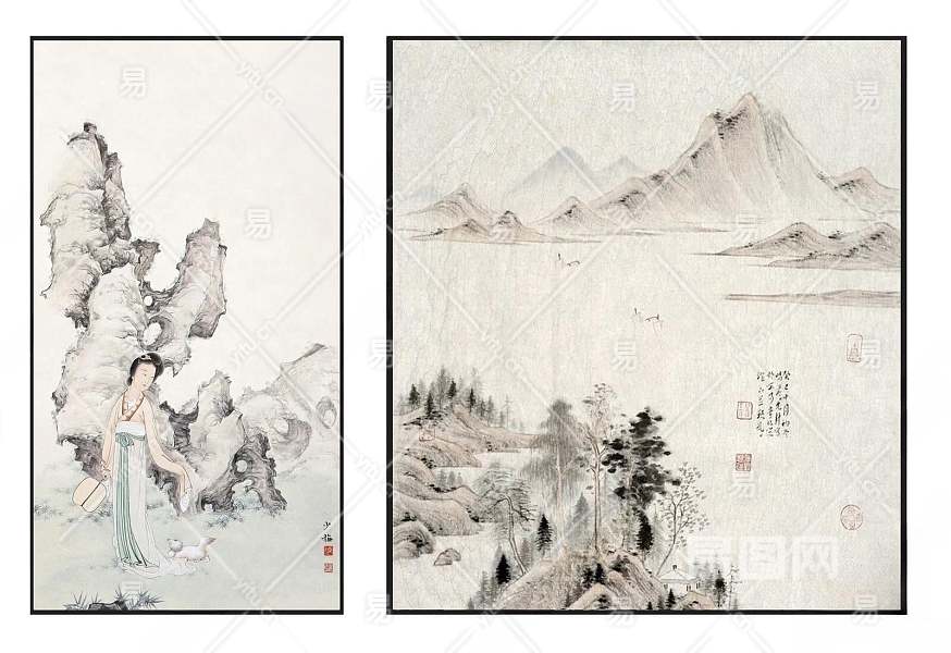 新中式雅致禅意山水风景人物场景挂画组合3D模型下载