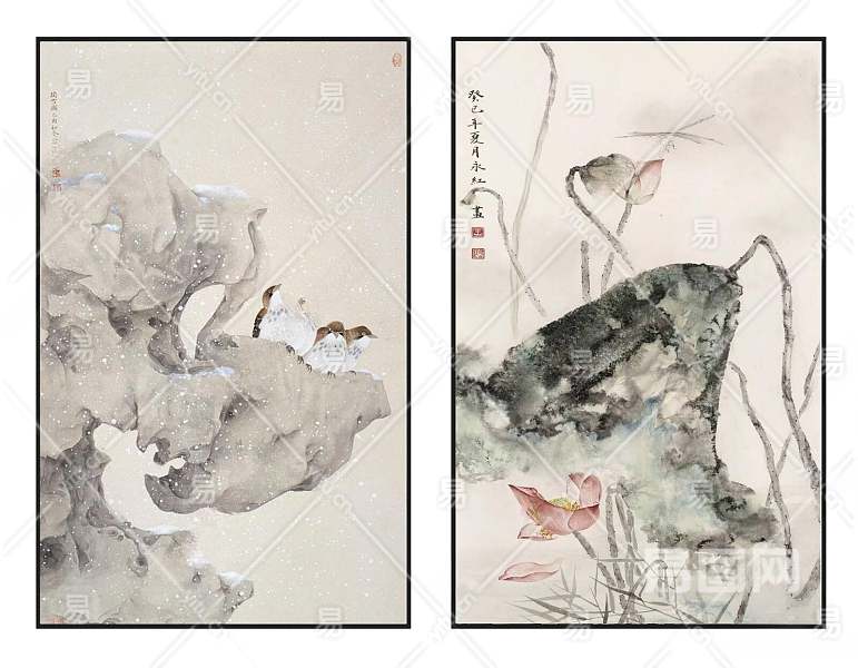 新中式清雅精致禅意花鸟太湖石挂画组合3D模型下载