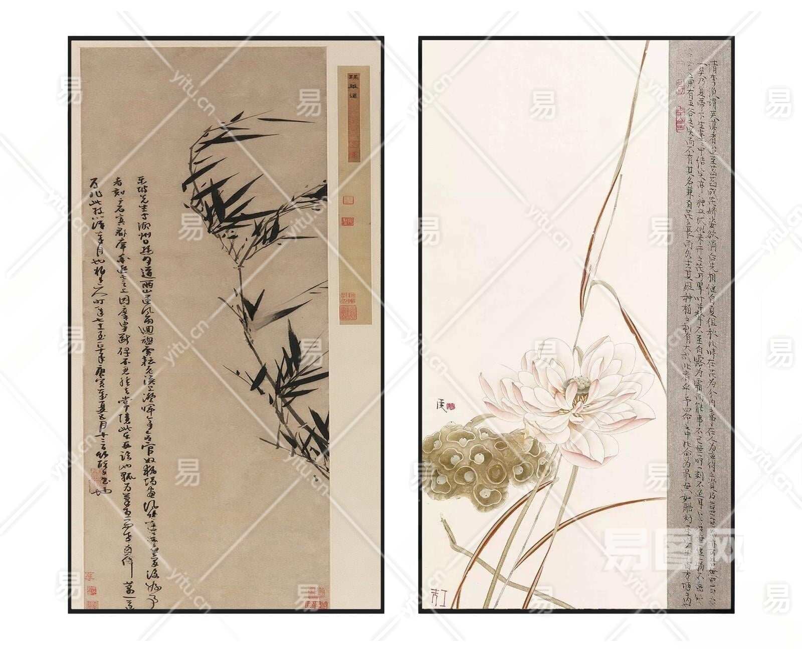 新中式雅致禅意荷花竹子挂画组合3D模型下载