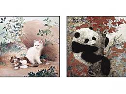 中式雅致猫咪熊猫植物图案挂画组合3D模型下载