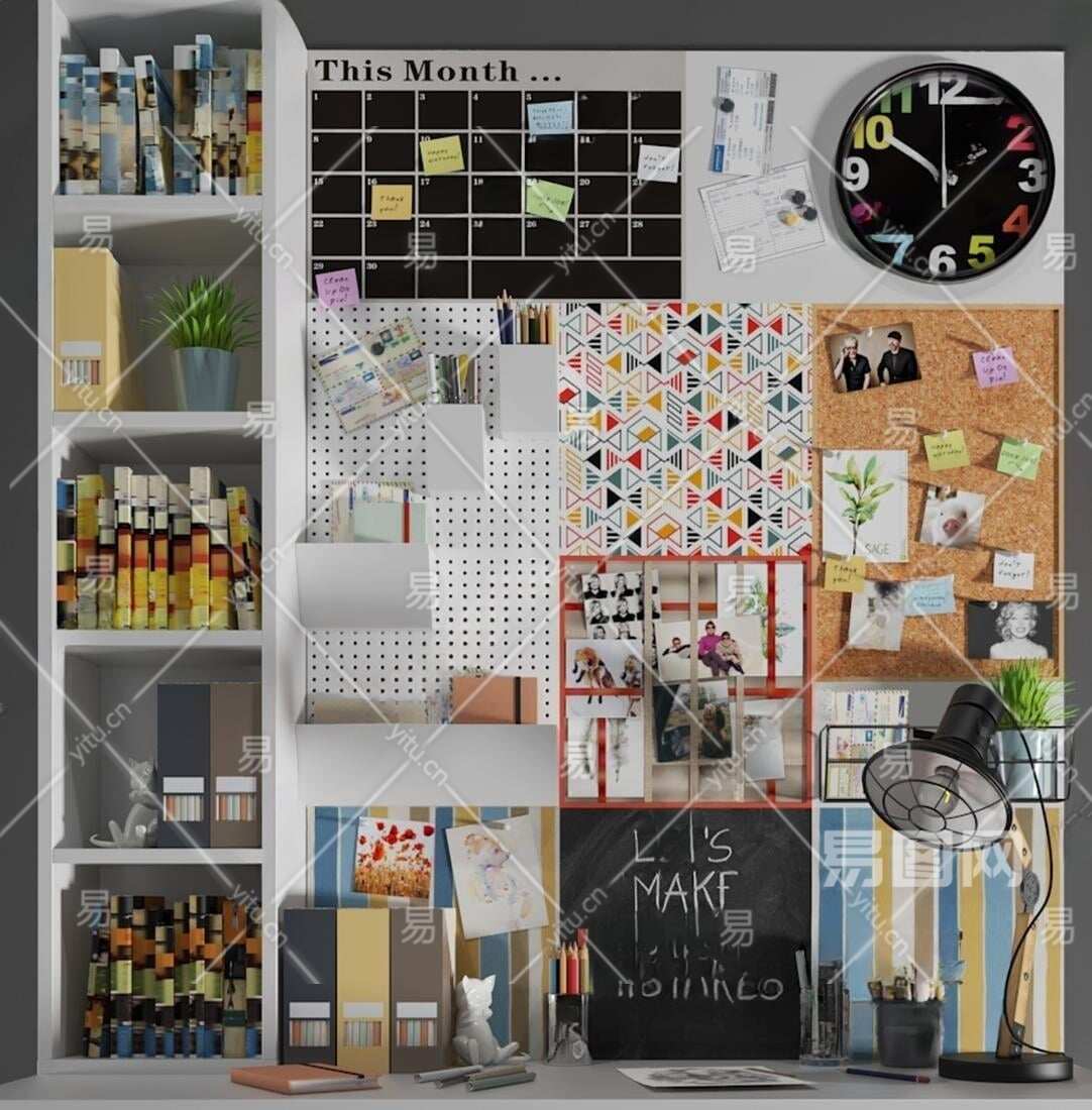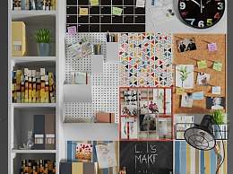 墙饰软木留言板照片墙办工文具组合3D模型下载