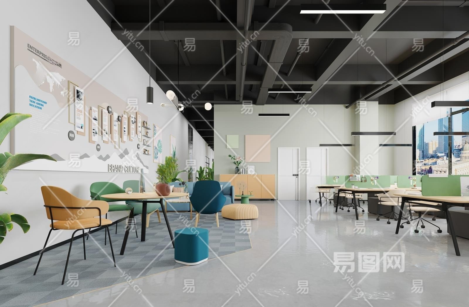 现代开放办公区3D模型下载