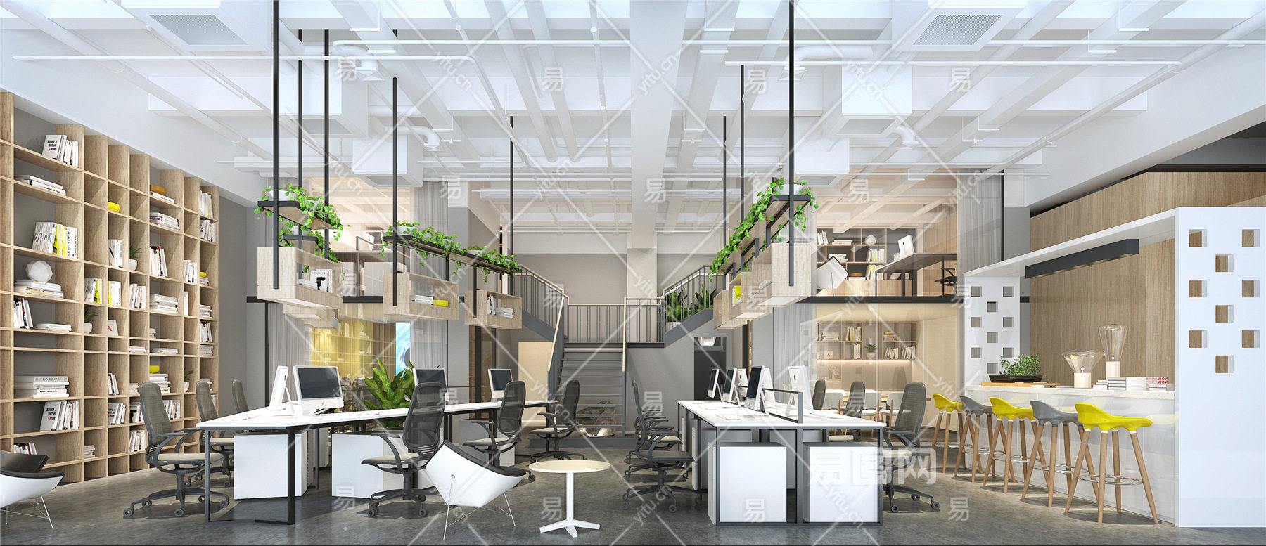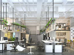 现代公共办公区 吊灯 绿植 书柜 办公桌椅 楼梯