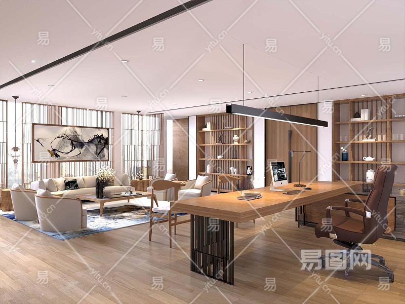 新中式办公室3D模型下载