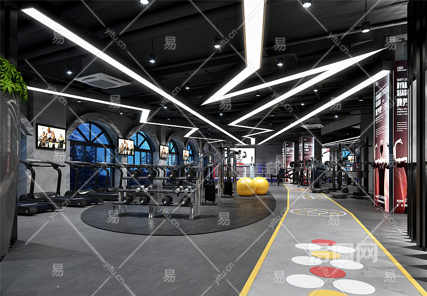现代健身房 吊灯 前台 健身器材 绿植 显示屏