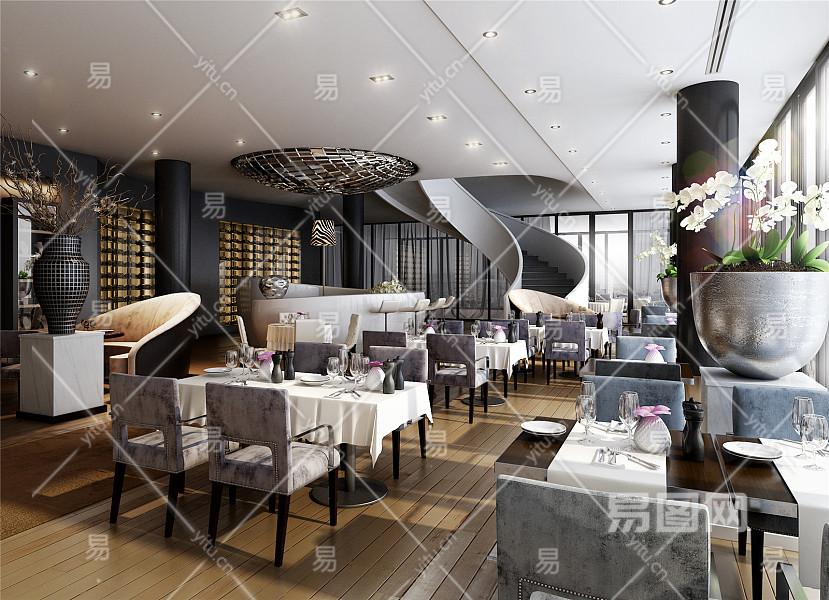 现代餐饮店 餐厅 餐桌 餐椅 吊灯 前台