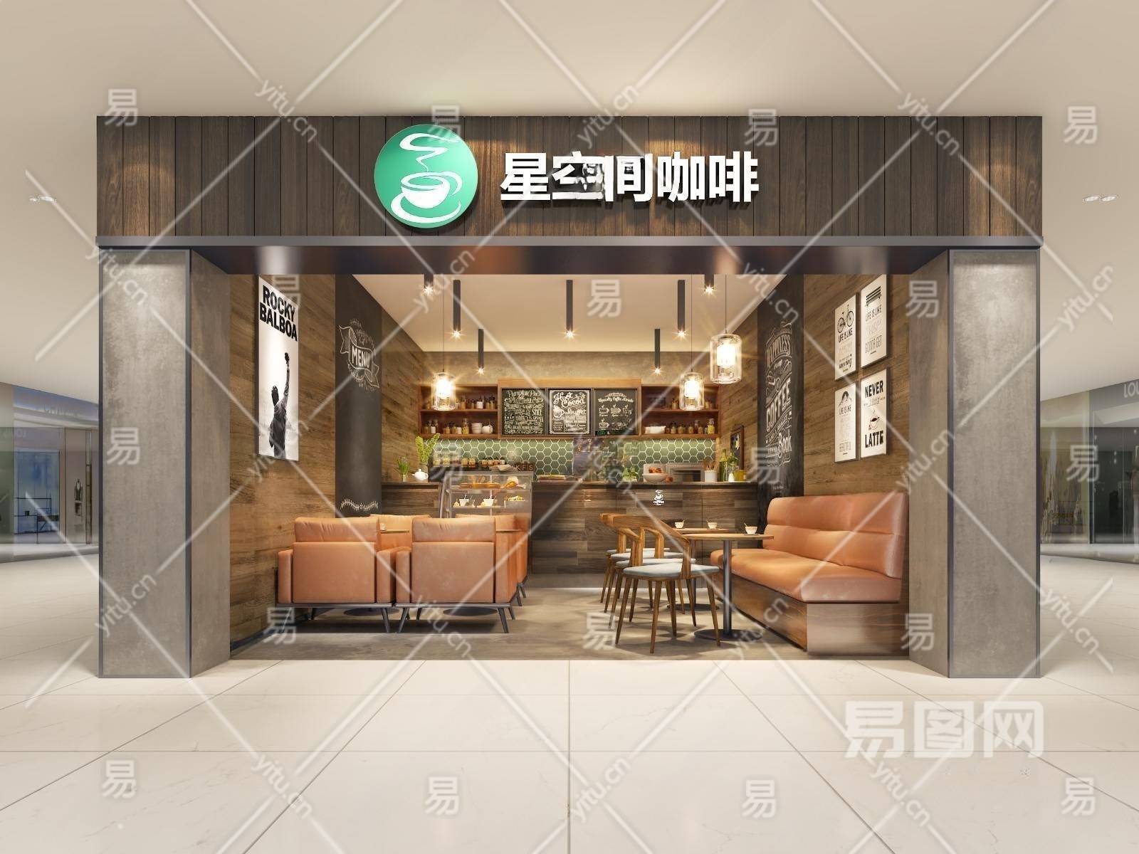 工业风的咖啡厅门面和室内设计3D模型下载
