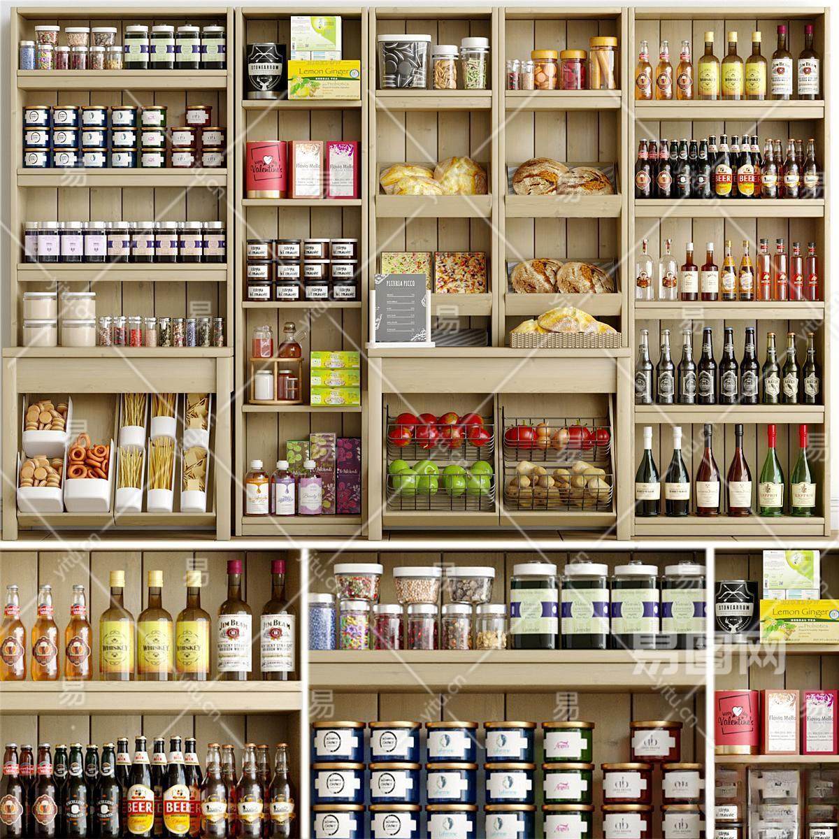 现代货架商品 酒水酒瓶面包罐头饼干零食蔬菜水果化妆品