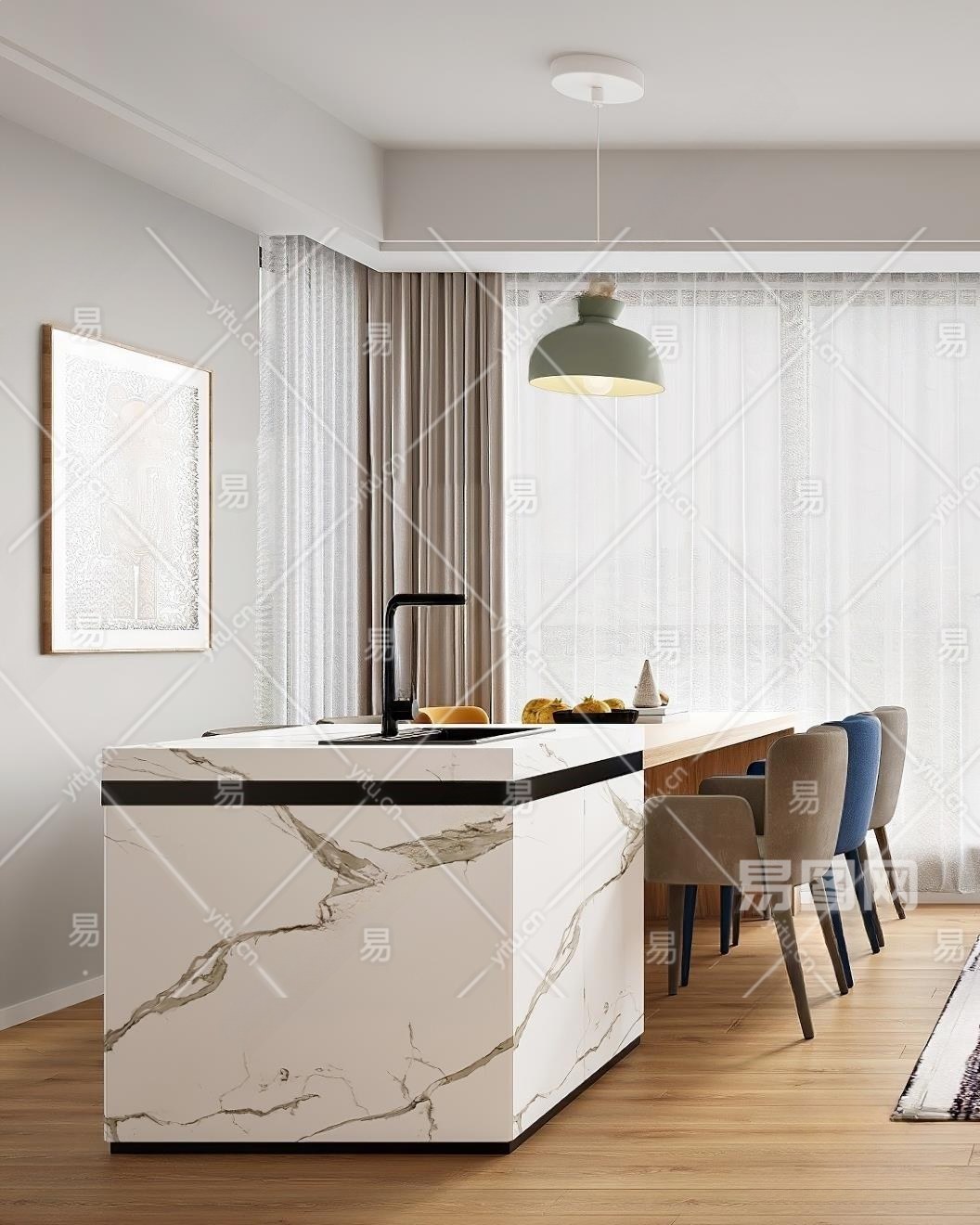 现代岛台餐厅3D模型下载