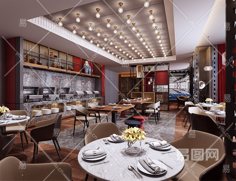 后现代酒店餐厅 餐桌 餐台 吊灯 桌椅