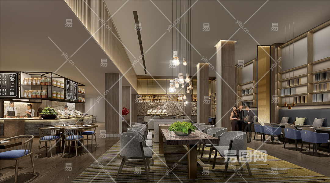 现代休闲餐厅 咖啡收银台 创意吊顶 桌椅