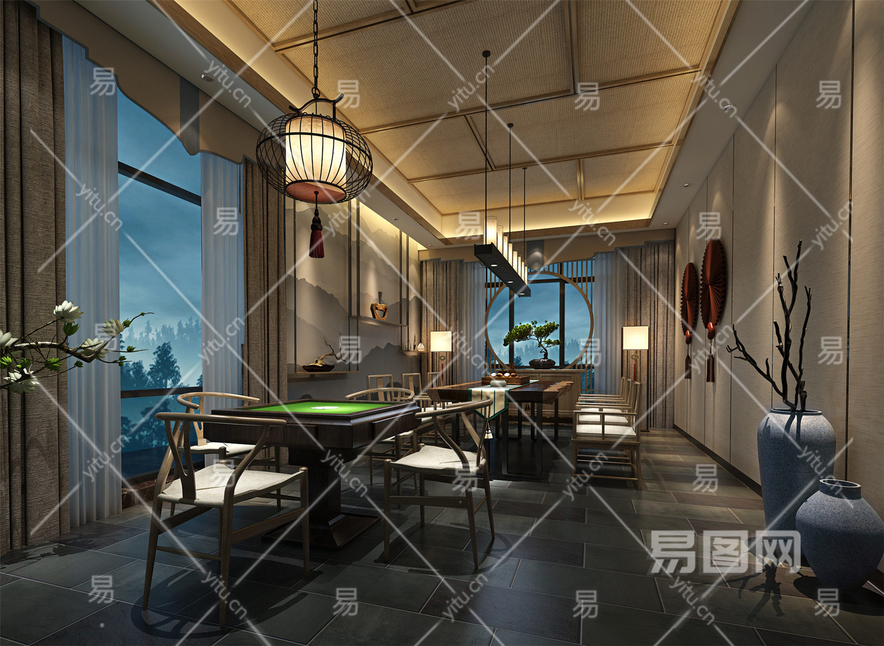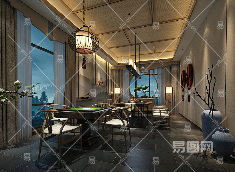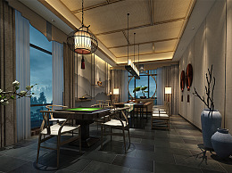 中式餐厅 餐桌椅 吊灯 墙饰 麻将桌 摆件
