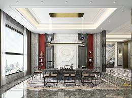 新中式茶室 水晶吊灯 壁灯 浮雕背景墙 装饰柜 茶桌椅组合 窗帘