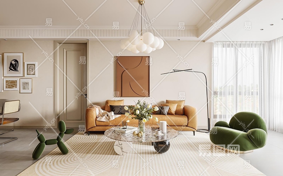 现代奶油风客餐厅3D模型下载