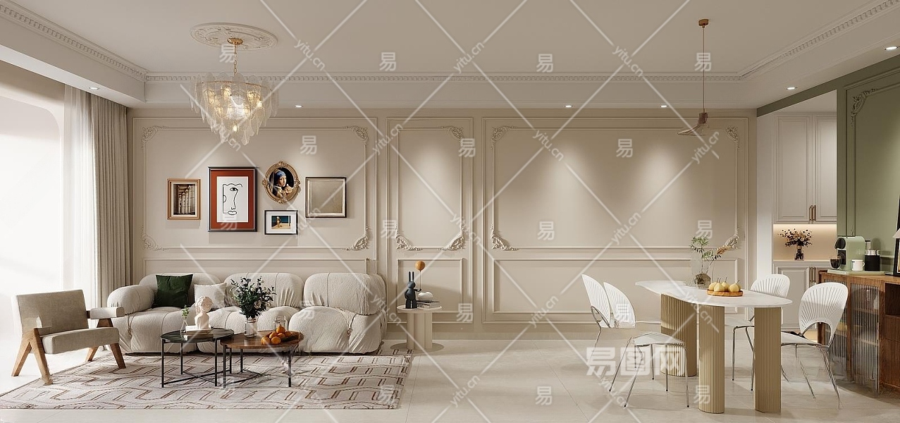 法式奶油风客餐厅3D模型下载