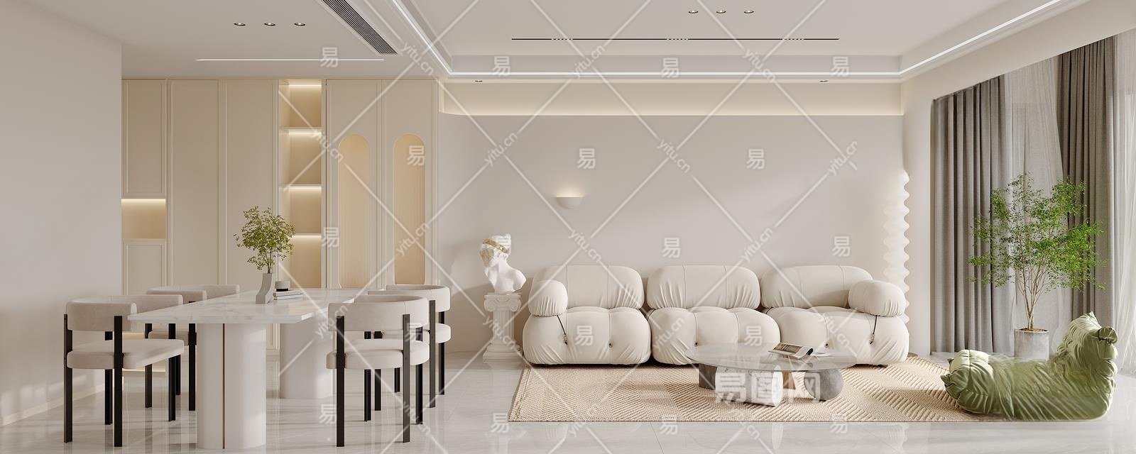 现代奶油风客餐厅3D模型下载