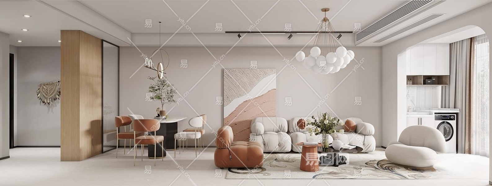现代奶油风客餐厅3D模型下载