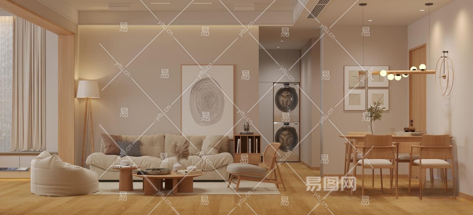 日式奶油风客餐厅3D模型下载