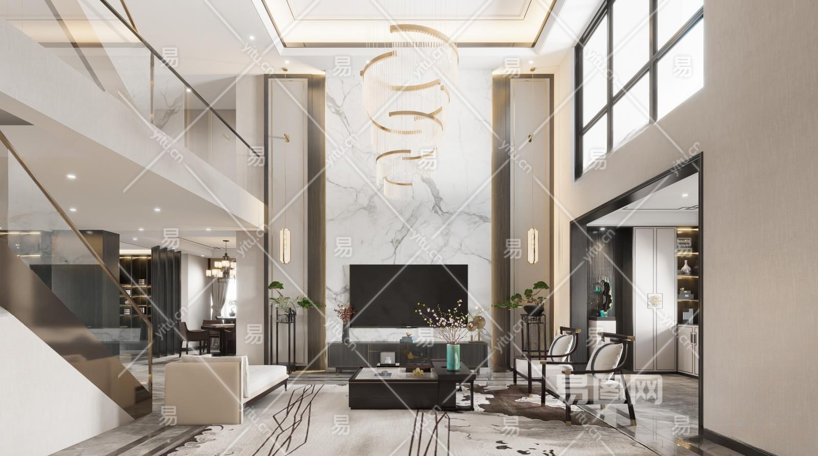 新中式别墅客餐厅3D模型下载
