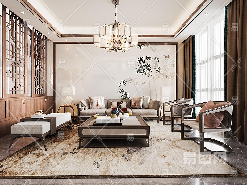 新中式别墅客餐厅3D模型下载