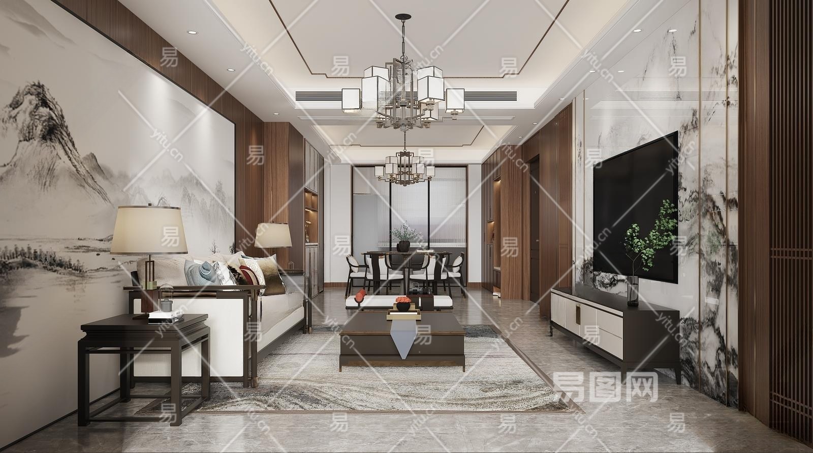 新中式客餐厅3D模型下载