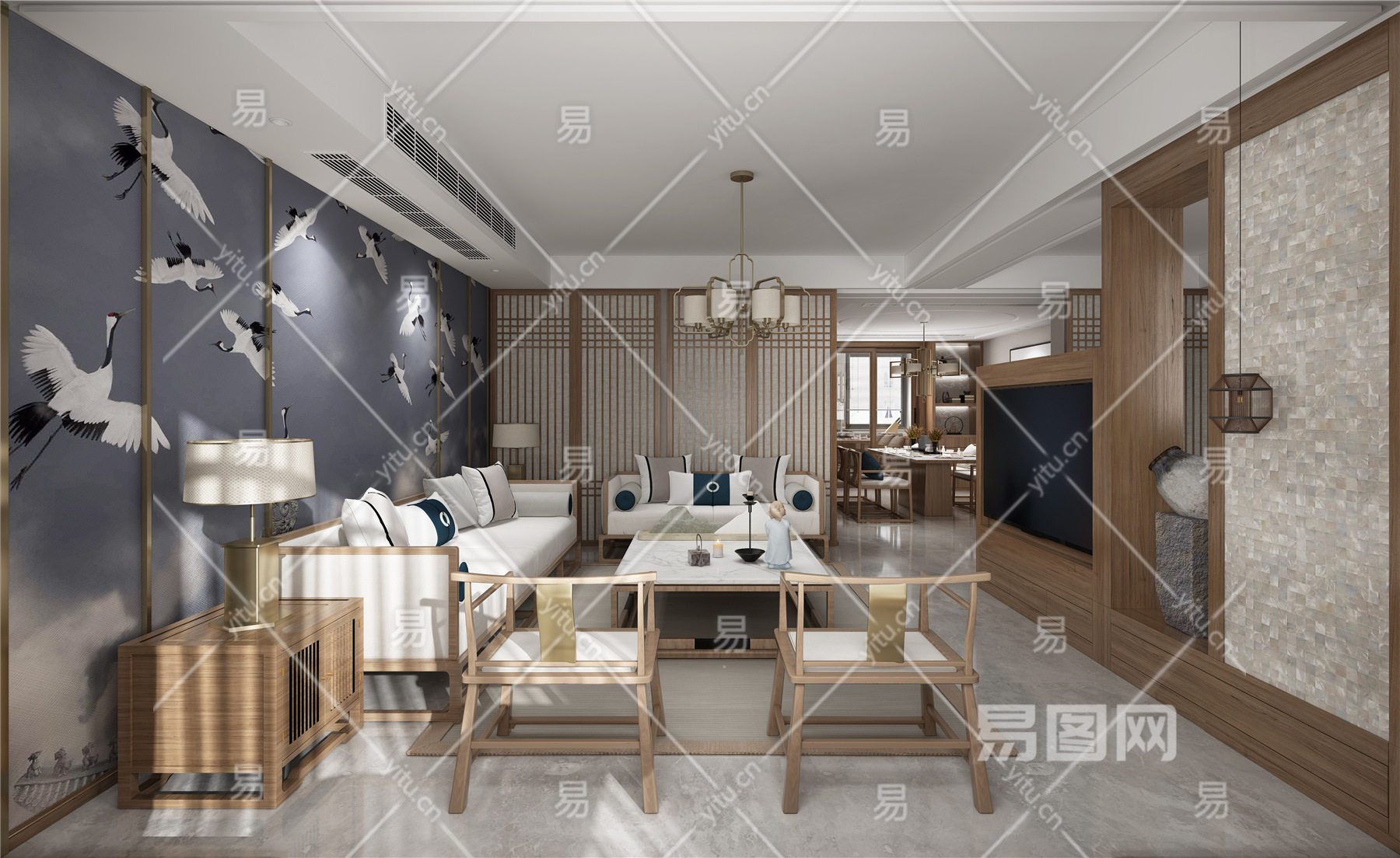日式客餐厅 吊灯 台灯 电视柜 餐桌椅 沙发 茶几 雕塑摆件