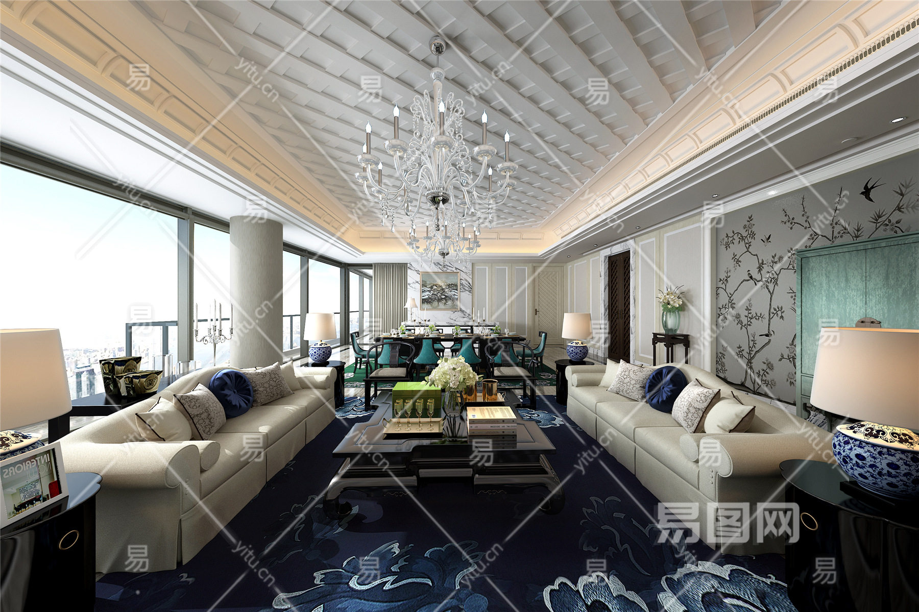 欧式古典欧式客餐厅 餐桌椅 沙发茶几 花瓶雕塑 吊灯台灯