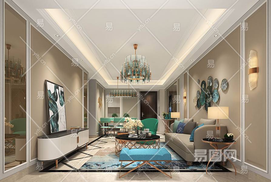简欧轻奢客餐厅 墙饰吊灯 壁灯台灯 沙发茶几 餐桌椅 电视柜