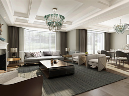 美式客餐厅 厨房吧台 吊灯 墙饰 雕塑 餐桌椅 沙发 茶几