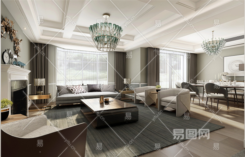 当前的位置:首页 > 3D模型 > 家装空间 > 客餐厅 > 美式客餐厅 厨房吧台 吊灯 墙饰 雕塑 餐桌椅 沙发 茶几