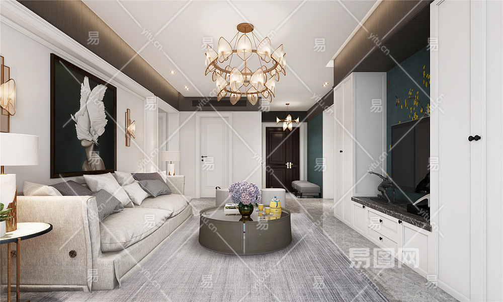 美式客餐厅 吊灯 餐桌椅 雕塑摆件 沙发 茶几