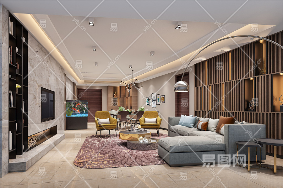 现代客餐厅 布艺沙发茶几组合 餐桌椅 落地灯 鱼缸 佛像