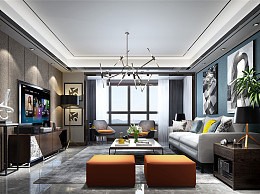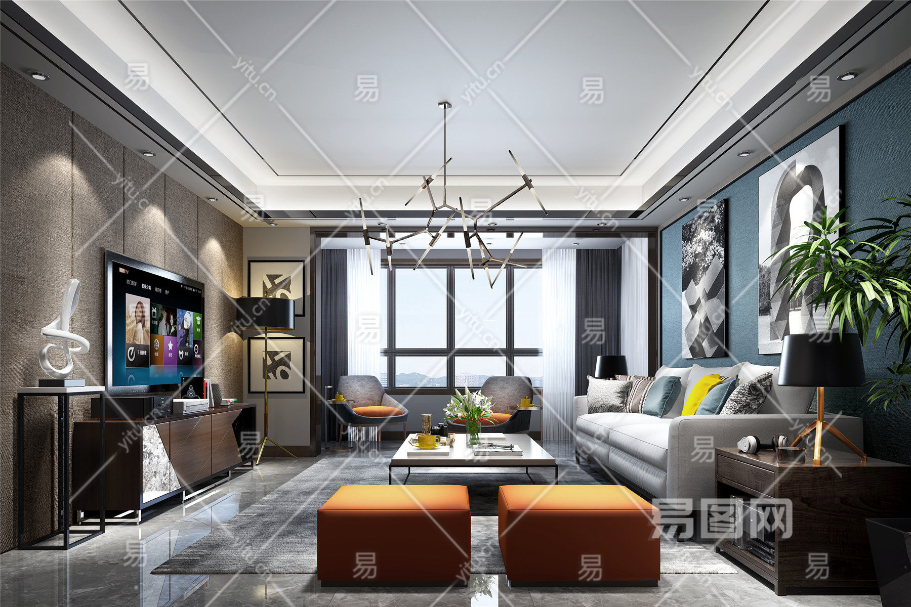 现代简约客餐厅 沙发茶几 餐桌椅 挂画 物件摆件 吊灯 墙饰品